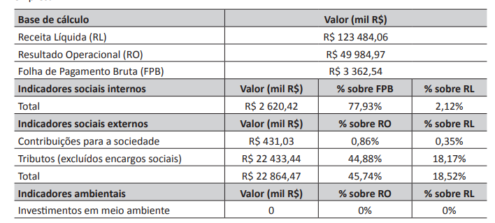 No Balanço Social, procura-se apresentar uma análise condensada do desempenho da empresa nos três pilares da sustentabilidade: econômico, social e ambiental. No que diz respeito ao pilar social, ainda dividem-se os gastos da empresa com funcionários (indicadores sociais internos) e com a comunidade em que está inserida (indicadores sociais externos).
